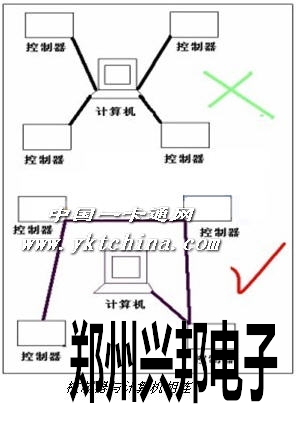 控制器通訊線(包括485/422、232和韋根等通訊線)必須采用國際通用的8芯屏蔽雙絞線,這樣可有效防止和屏蔽干擾。線徑大于0.3mm總線長度不超過1200建議在1000米以內,如果更長請選用其它專用485/232轉換器或者加中繼器,并選用更粗的通訊電纜。控制器GND 485- 485+分別對應連接485轉換器GND TD(A) TD(B),通訊線路采用串聯掛接式連接,請勿采用星型連接或者局部星型連接(如圖)。