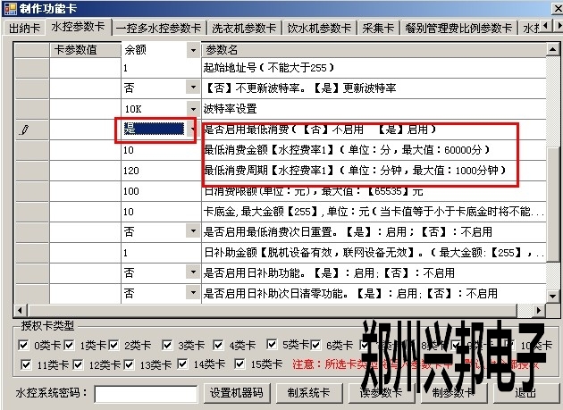 2)打開軟件 制卡中心-功能卡制作-水控參數(shù)卡中的最低消費周期,先選擇啟用,然后輸入最低消費金額和最低消費周期,最低消費金額以分為單位,最低消費周期以分鐘為單位,設(shè)置好后點擊制參數(shù)卡即可;