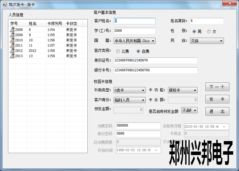 批量發卡是在有多條未發卡信息的條件下直接連續發卡,未發卡信息可以在信息設置中手動錄入也可以通過導入信息表,將未發卡人員信息手動導入。然后點擊批量發卡。