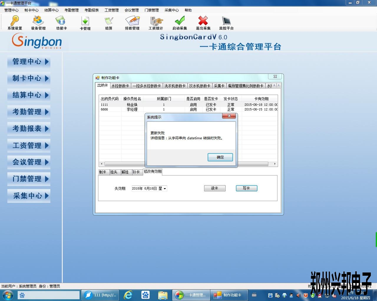 有客戶反應,在使用食堂消費機軟件時登錄出納卡的時候提示己過有效期,進入軟件修改有效期的時間出現了報錯,出現了更新失敗,從字符串向datetime轉換失敗。這是什么情況造成的呢?