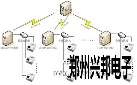 如上圖所示,整個系統的管理電腦單獨存在,在剛開始建設時就把各個分店的電腦數據庫單獨建立,制作卡片時,通過卡片的號碼段位來區分各店的范圍,只是在需要傳輸數據時,通過花生殼軟件等工具綁定IP地址,使各家分店和總部服務器之間的通訊無地理的局限,實現整個系統數據的實時交換。